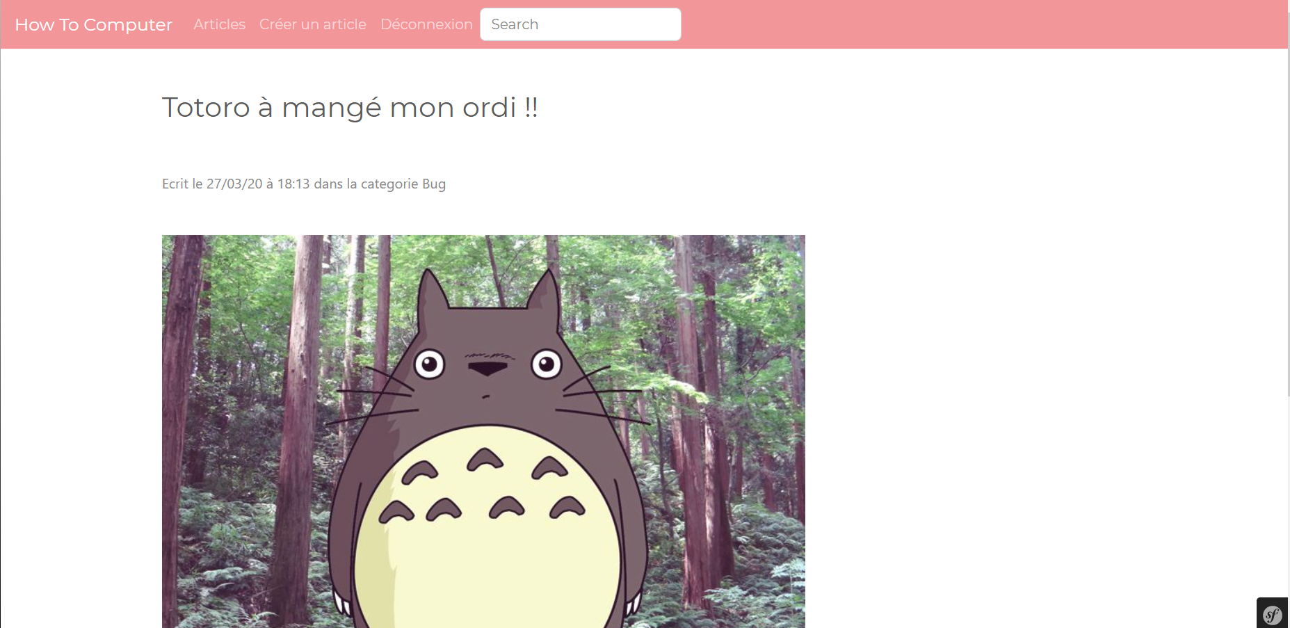 How To Computer est un site web réalisé en Symfony 4. Après avoir travaillé le PHP, j'ai découvert l'utilisation du Framework Symfony. Ce site n'avait pas de contexte particulier. L'objectif était de me familiariser avec une architecture MVC et d'en comprendre les principes. Bien sûr, je me suis aidée de tutoriels YouTube créer par Lior Chamla. Entre autres, j'ai appris à utiliser l'ORM Doctrine, le système de migration, les fixtures... J'ai également implementé des formulaires et enfin la découverte du composant Security de Symfony.